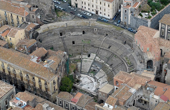 | Το αρχαίο Ρωμαϊκό θέατρο της Κατάνης μέσα στην σύγχρονη πόλη. Χτίστηκε επάνω υπάρχον αρχαίο Ελληνικό. |