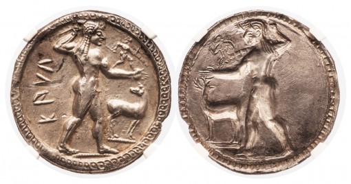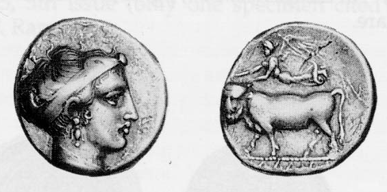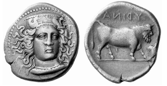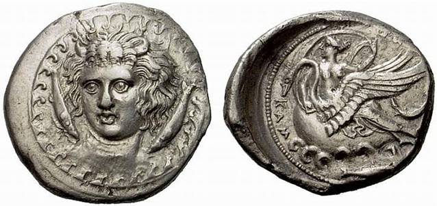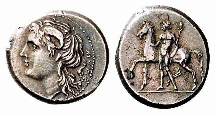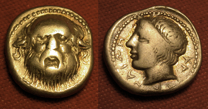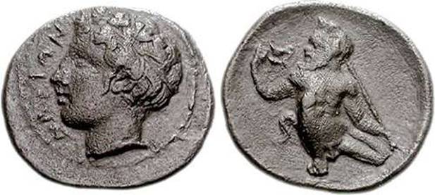 Ο θεός ποταμός Αμένανος σε νομίσματα της Κατάνης ΔΕΞΙΑ . Η νύμφη Ιμέρα με αρχαϊκό λοξό χιτώνα σε νόμισμα της Ιμέρας |